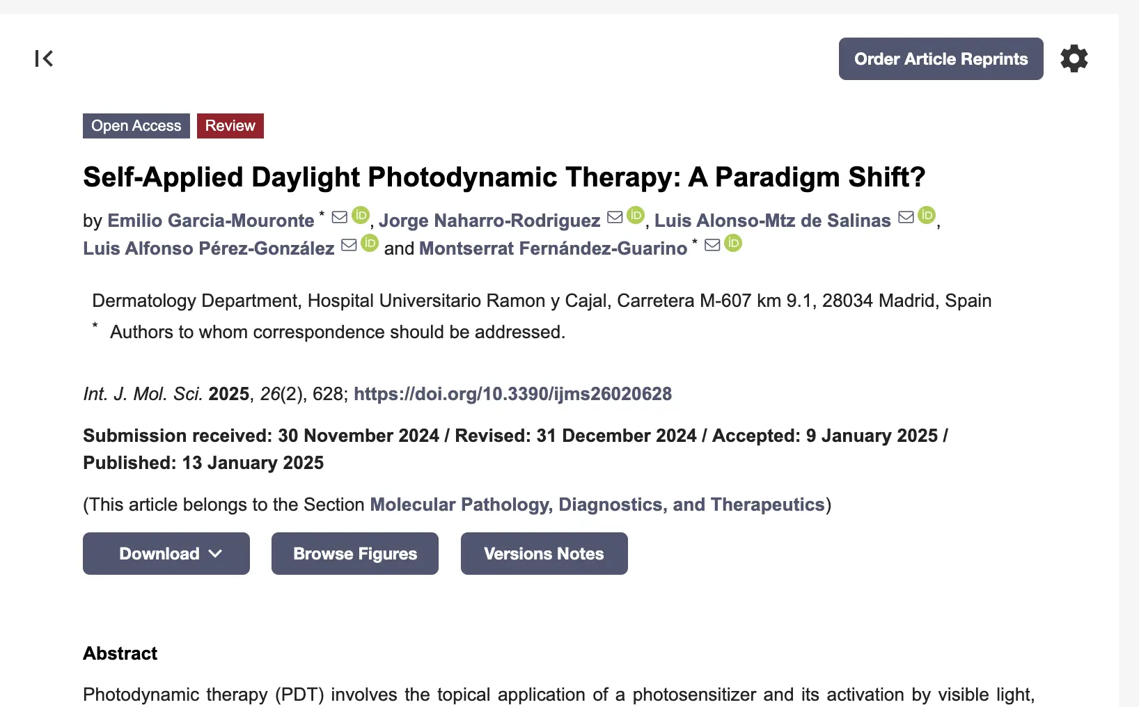 La Dra. Montserrat Fernández Guarino ha publicado recientemente un artículo titulado «Self-Applied Daylight Photodynamic Therapy: A Paradigm Shift?» en colaboración con Emilio Garcia-Mouronte, Jorge Naharro-Rodriguez, Luis Alonso-Mtz de Salinas y Luis Alfonso Pérez-González, en la revista International Journal of Molecular Sciences (Int J Mol Sci). Este trabajo explora de manera integral la terapia fotodinámica diurna autoadministrada, analizando sus mecanismos de acción, eficacia y potencial para revolucionar el tratamiento de patologías cutáneas premalignas e inflamatorias.