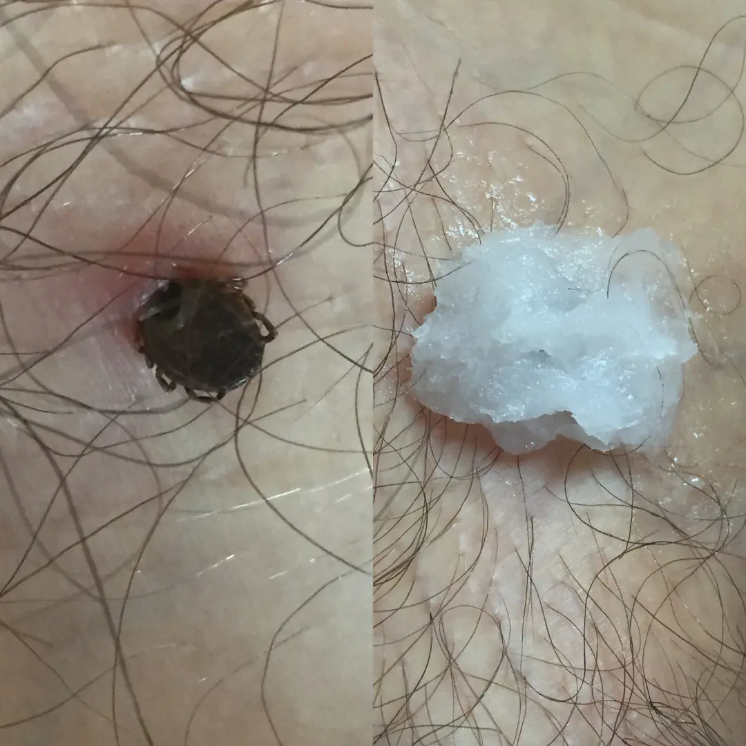 Imagen de un paciente con una garrapata adherida a la piel y la vaselina aplicada para poder extraerla sin resistencia y sin dejar restos en su interior.